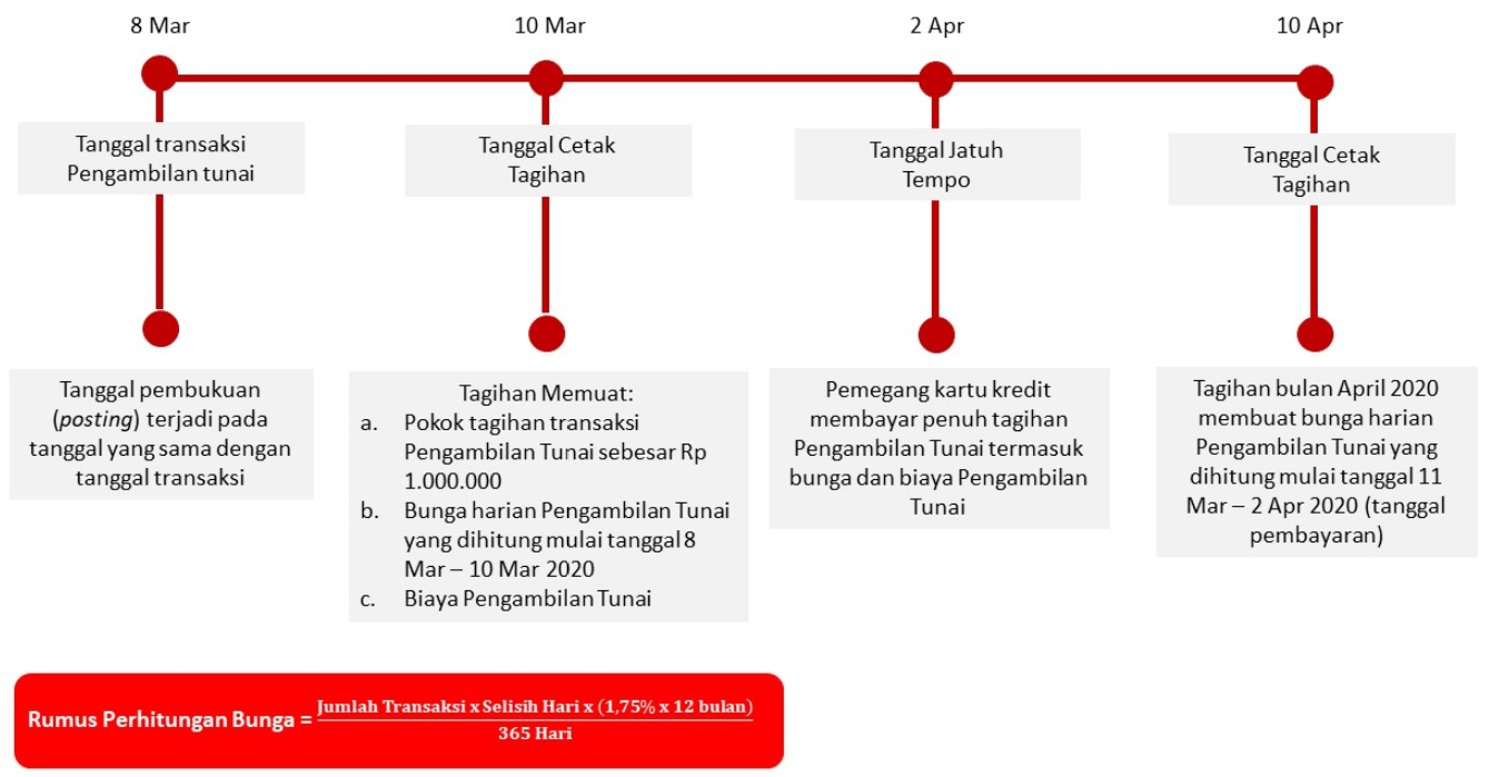 Bunga untuk Pengambilan Tunai (Cash Advance) dibebankan dan dihitung sejak Tanggal Penarikan (Cash Advance) sampai dengan tanggal dilakukannya pembayaran penuh dari transaksi Pengambilan Tunai tersebut. Suku bunga yang berlaku untuk transaksi Pengambilan Tunai tercantum pada Lembar Penagihan. Biaya. denda. ataupun bunga yang belum dibayarkan tidak termasuk dalam komponen perhitungan bunga. Untuk perhitungan bunga secara lengkap dapat dilihat pada ilustrasi Perhitungan Bunga Kartu Kredit.